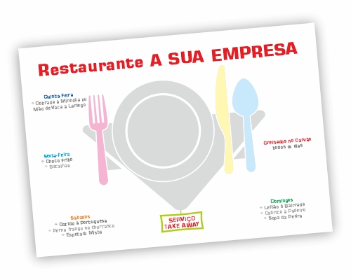 Criamos a arte gráfica e a impressão dos toalhetes/individuais de mesa. Este serviço não inclui a criação de logotipo, apenas dos toalhetes/individuais de mesa.